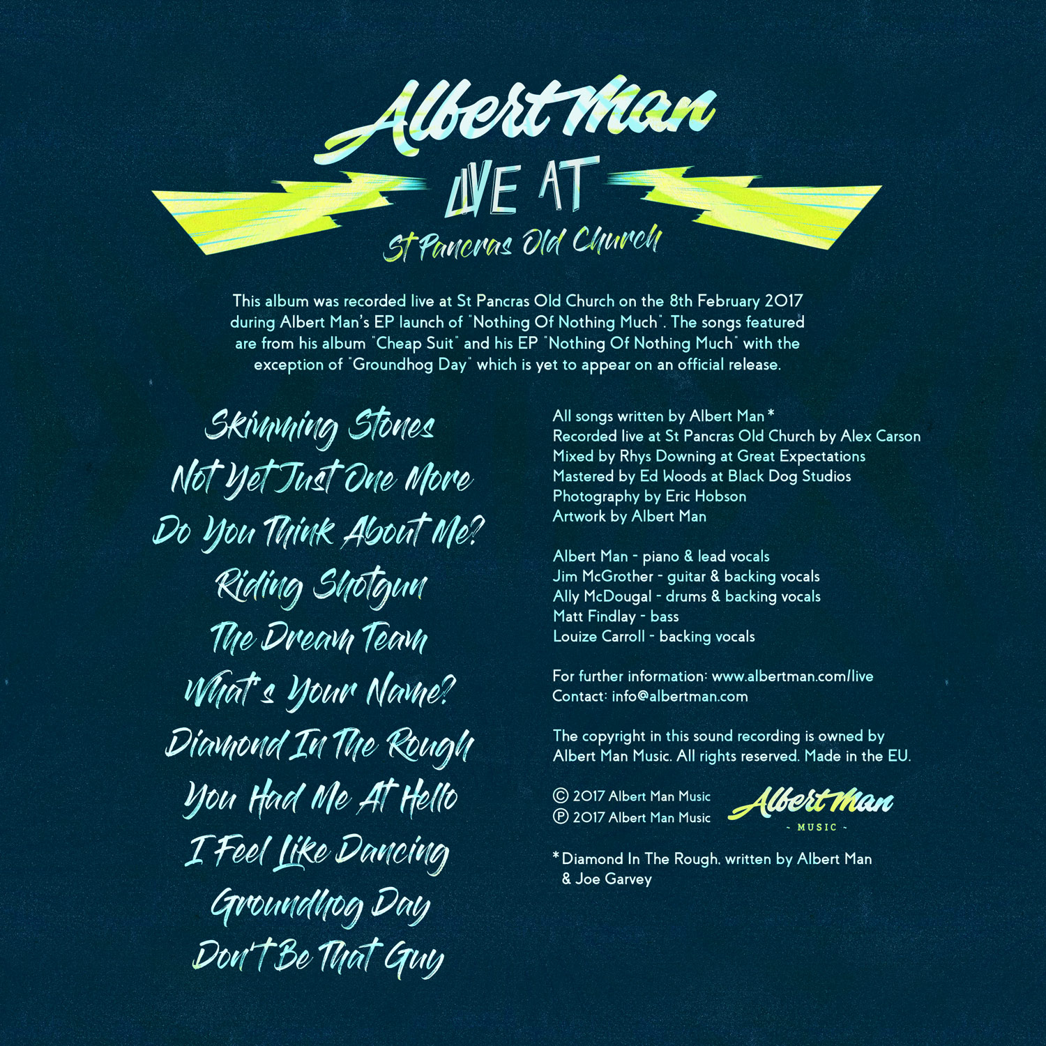This album was recorded live at St Pancras Old Church on the 8th February 2017 during Albert Man’s EP launch of “Nothing Of Nothing Much”. The songs featured are from his album “Cheap Suit” and his EP “Nothing Of Nothing Much” with the exception of “Groundhog Day” which is yet to appear on an official release until now.